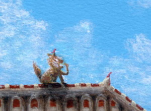 獅子のくせに頭には鳥もとまっています。